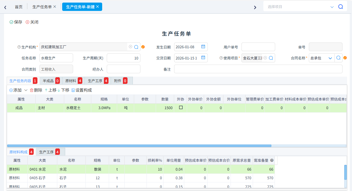 與甲方或者客戶簽訂承包或者銷售合同后,公司技術(shù)人員根據(jù)合同設(shè)置物料BOM(配比),生產(chǎn)管理部人員根據(jù)公司生產(chǎn)情況編輯生產(chǎn)任務(wù)單,在編輯生產(chǎn)任務(wù)單時(shí)可以設(shè)置是否外協(xié)、原材料構(gòu)成和工序。如需采購原材料交由采購部人員采購原材料。如果庫存有原材料車間人員直接從原材料倉庫領(lǐng)用原材料,多領(lǐng)的材料可以退料。生產(chǎn)出半成品或者成品可以入庫,如入庫半成品,可以再次領(lǐng)料,直至生產(chǎn)出成品,生產(chǎn)出成品后對外銷售填寫銷售出庫單并收款,期間生產(chǎn)車間人員可以根據(jù)工序上報(bào)生產(chǎn)進(jìn)度。