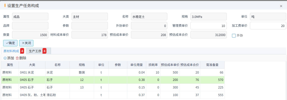 選擇需生產(chǎn)的材料后可以點(diǎn)擊設(shè)置構(gòu)成,再次調(diào)整物料BOM。在原材料構(gòu)成這里可以設(shè)置預(yù)估成本單價(jià)和查看原材料需求總量。