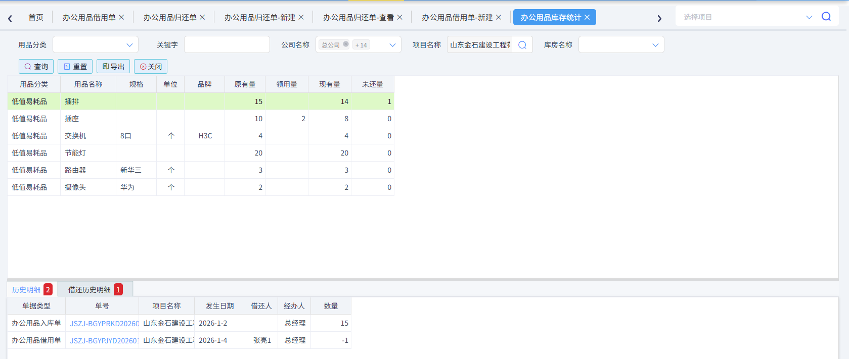 辦公用品統計,此查詢可看到項目中的用品庫存情況,如入庫量、領用量、現存量、未還量等,如下圖所示,