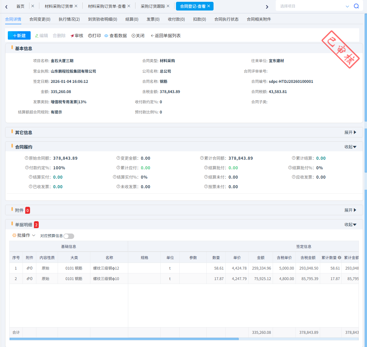 我們以生成合同為例,在合同里可以操作合同變更、材料到貨驗收、材料退貨、材料結算、合同扣款、合同預付款、合同結算付款、合同收進發票。