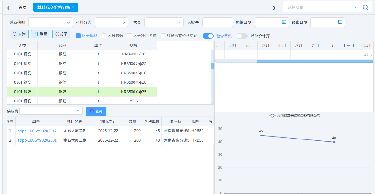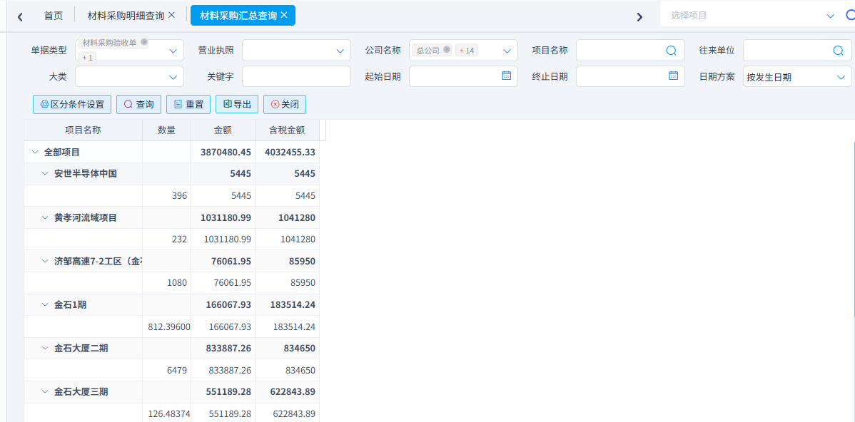 用于按照項目匯總材料采購總數量和總金額