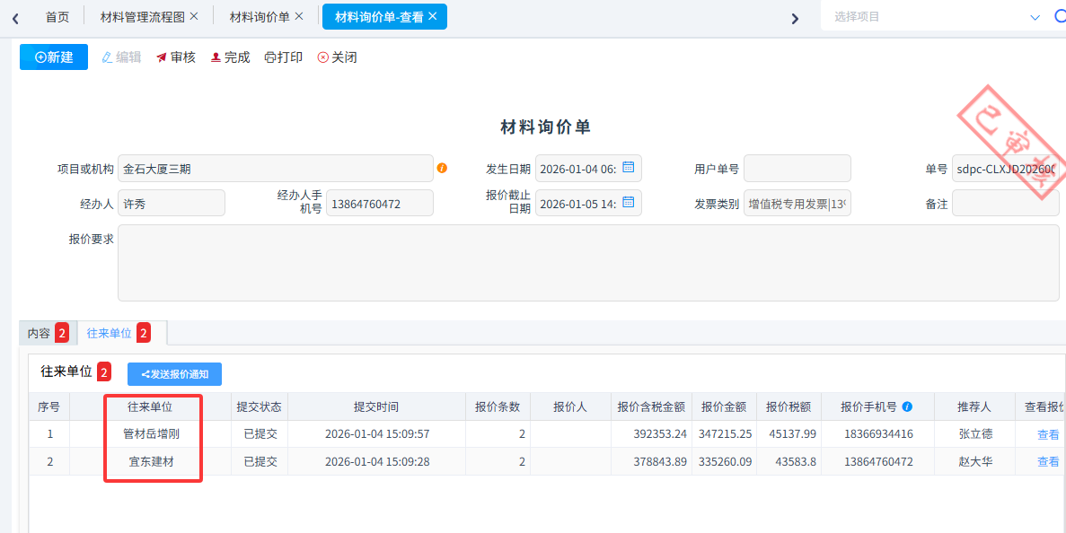 供應商提交報價后,會自動發送短信給公司詢價人,詢價人在系統就可以查看報價并進行比價。