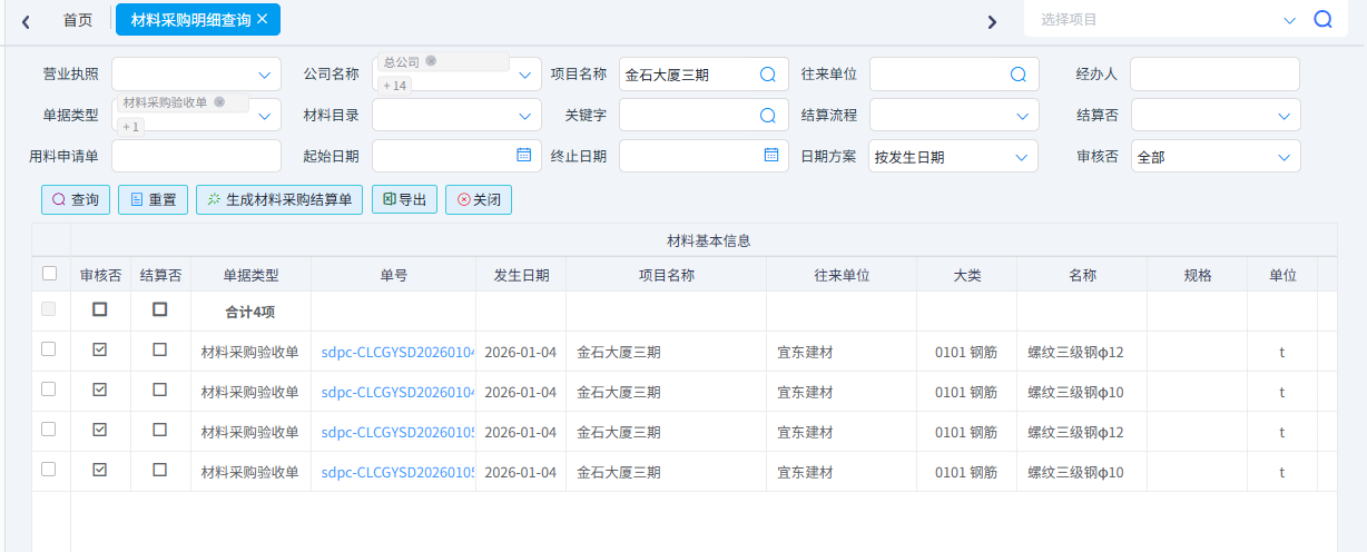 用于查詢所有類型的材料單據的內容明細。該功能可滿足關于材料明細的任何形式任何條件的查詢。可以按照單據類型、項目名稱、供應商、材料名稱、時間等條件進行篩選。可以導出Excel表格。