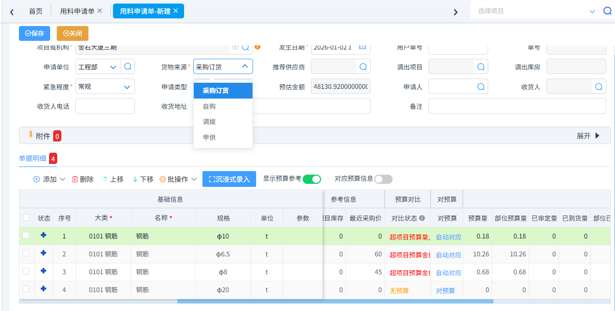 首先由項目現場施工員根據工程進度填寫用料申請。申請材料明細可以從工料機預算中調取,超出預算時系統會進行預警,當購買的材料跟預算不一致是還可以手動對應預算。在用料申請單還可以選擇貨物來源,選擇采購訂貨、自購、調撥、甲供。其中選擇采購訂貨可以生成采購訂貨單和采購合同一般用于大宗采購或者集采。選擇自購可以直接生成采購訂貨單,一般用于零星采購或者項目部直接采購。調撥用于申請項目調撥材料使用,后續可以生成材料調出單。甲供用于申請甲供材料,后續可以生成材料甲供驗收單。