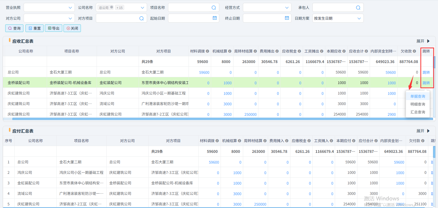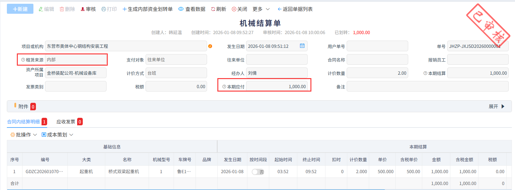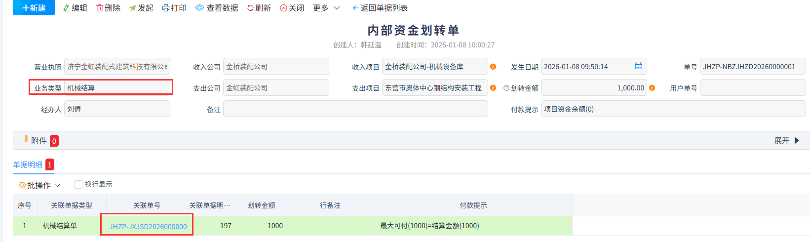 如:針對上圖的機械結算單進行資金劃轉