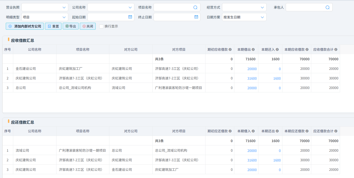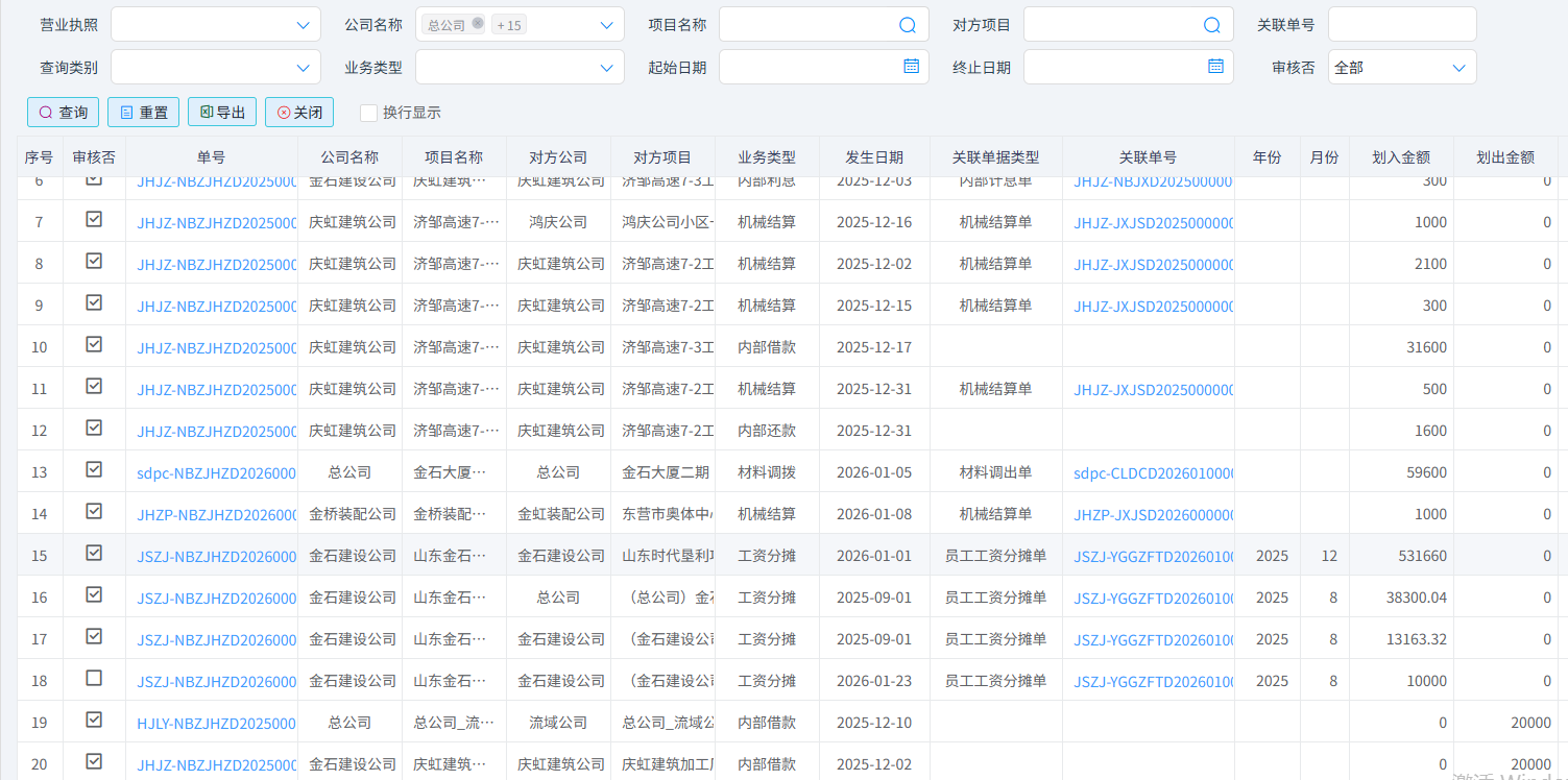 大部分內部業務是先有內部結算(如【機械結算單】、【周轉材結算單】、【費用分攤】、【材料調撥】、【工資分攤】、【項目補繳稅金】、【內部借款】、【內部還款】、【內部利息】)再以內部結算進行企業內部資金劃轉,每筆結算和劃轉必須是相同一個“營業執照”內不同機構或項目之間的內部往來,可規范內部資金流轉,確保資金調撥有跡可循、審批合規便于財務部門統一核算、對賬和資金管控。