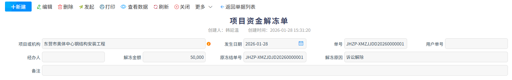 項目資金解凍單是配套【項目資金凍結單】的風控單據,用于對已凍結的項目資金發起解凍申請、完成審批流程并留存正式記錄,核心是按規解除資金的支取與流轉限制,讓凍結資金恢復正常使用狀態。