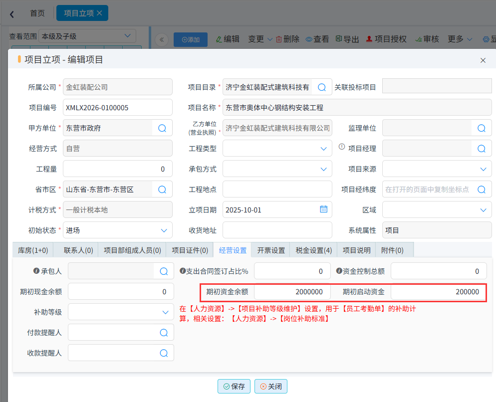 (1)項目內部資金期初設置